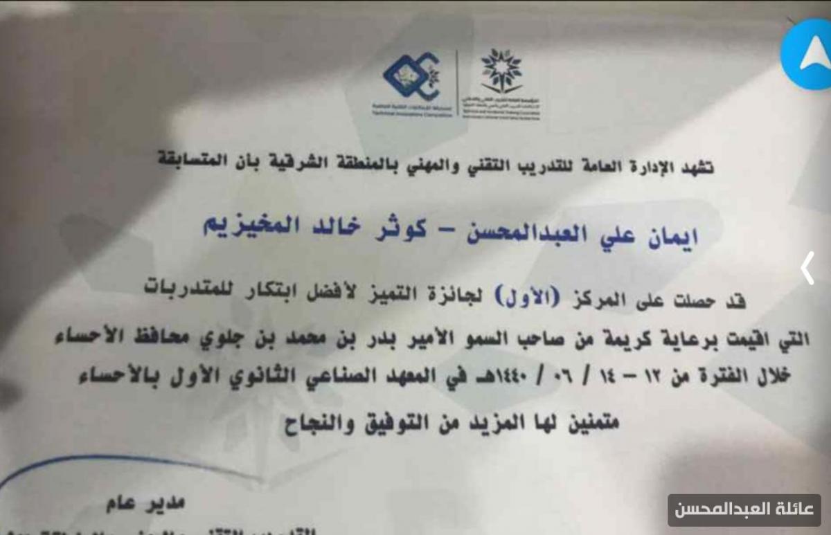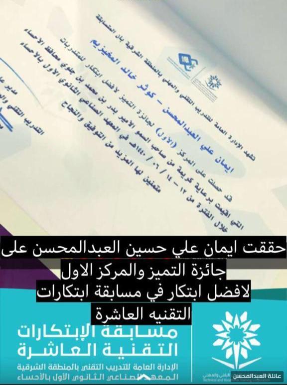 نظمت الادارة العامة للتدريب التقني والمهني بالمنطقة الشرقية مسابقة لأفضل ابتكار لفئة المتدربات فما كان من الشابة ايمان علي حسين ابراهيم العبدالمحسن الا ان تألقت وحققت المركز الاول وجائزة التميز بكل جدارة واستحقاق في هذه المسابقة عن ابتكار (النرد الالكتروني)