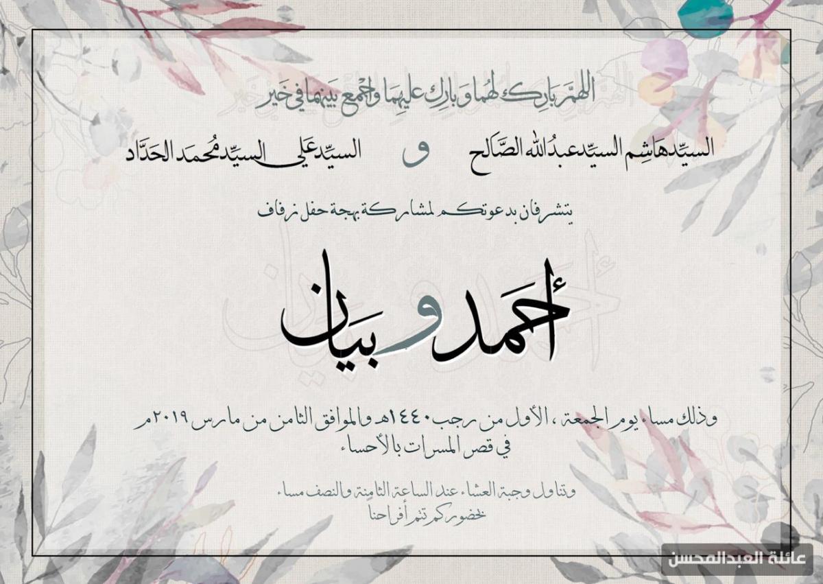 وسط حضور من الاهل والاحبة احتفل السيد الدكتور هاشم الصالح بزفاف نجله السيد أحمد وفي بادرة جميلة تقدم اعضاء المركز الثقافي بتكريمه ومنحه وسام العطاء نظير ما قدمه من دعم للمركز الثقافي وملعب العبدالمحسن منذو نشئتهما ايماناً منه بدورهما الرائد في حفظ النشئ متمنين للمتزوجين حياة سعيدة