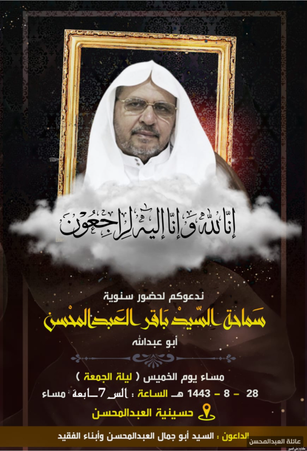 بحضور عدد من أبناء العم الأعزاء وأهالي البلدة الكرام وبدعوة كريمة من السيد أبوجمال وأبناء الفقيد السعيد تم إحياء الذكرى الأولى على رحيل سماحة السيد باقر العبدالمحسن (ابوعبدالله) شارك في التأبين سماحة العلامة الشيخ حسين العايش وسماحة الشيخ نجيب الحرز وعدد من طلبة العلوم الدينية والمؤمنون نسأل الله له المغفره والرحمه وأن يحشره مع من أحب وتولى ويمن على أهله ومحبيه بالصبر والسلوان وإنا لله وانا اليه راجعون